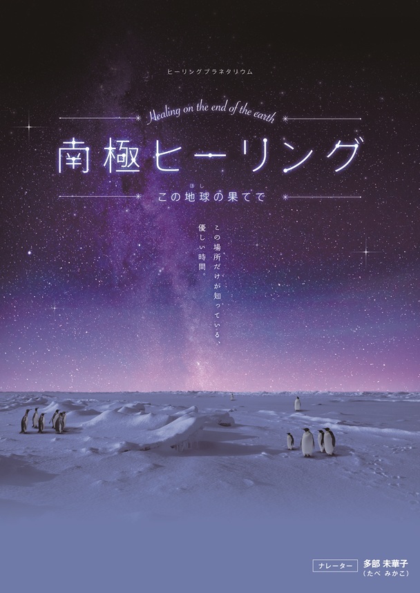 南極ヒーリング この地球の果てで 地球で一番寒い場所、南極。厳しく、過酷な気象条件が人類を遠ざけてきた氷の大陸には、昔のままの雄大で美しい自然環境が残されています。澄んだ空気に映る蜃気楼、大気を舞う氷の結晶に太陽光が反射してできる太陽柱、そして日本では限られた場所からしか見ることのできない、南十字星をはじめとする満天の星。 まさに癒しを追求した大人のためのヒーリングプラネタリウムです。 制作・配給 コニカミノルタプラネタリウム(株) |
